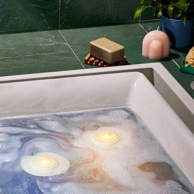 Unwind your body and mind with a symphony of aroma, flickering flameless candles, and colorful lights. Add a drop of included “In Bloom: Calm” Lifelines Essential Oil Blend to diffusion rings and place the pair of lily pad-inspired diffusers into the tub. Soothing colored lights and flameless candles will automatically illuminate your bath, and lavender and chamomile will create an extraordinary aroma experience. Add the perfect amount of oil, with no guesswork and no spills using our patent pending Precision Pump™.