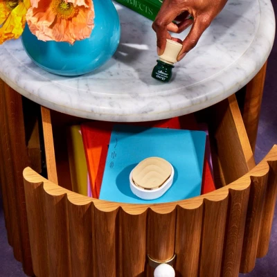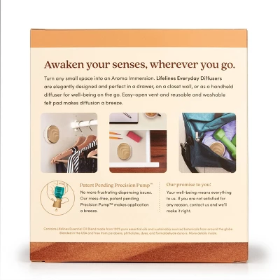 Awaken your senses with a lightweight diffuser that requires no batteries or cords. Fits perfectly in a drawer, bag, or on a closet wall so stress relief is always a click away. Simply press to release scent and press again to close. Includes Lifelines Essential Oil Blend in “Walk in the Woods: Energy” and two wall mounts to transform any space into an aroma immersion. Add the perfect amount of oil with no guesswork and no spills using our patent pending Precision Pumpā¢.