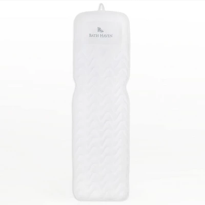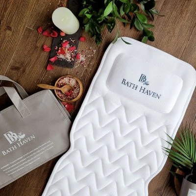 Our Quilted Bath Bed from Bath Haven is designed for comfort and soothing relaxation so you can bathe in bliss. The long breathable cushion and built-in pillow envelopes your head, neck, back, and shoulders to provide full-body support against the hard surface of the bathtub. These bath beds come with 13 non-slip suction cups to keep your cushion firmly in place, as well as a washing bag and travel bag for easy cleaning and convenience.