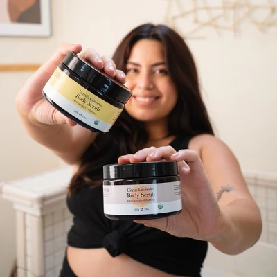 This exfoliating sugar scrub revitalizes dull skin for a radiant glow. Packed with thirst-quenching oils, antioxidants, and anti-bacterial agents, our certified organic scrub will leave your skin feeling hydrated and nourished. Smooth skin is just a scrub away. This exfoliating scrub is body care at its finest. It’s a skin exfoliator for body that is a bath scrub or shower scrub to exfoliate away dead skin suitable for all skin types.