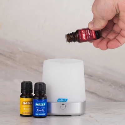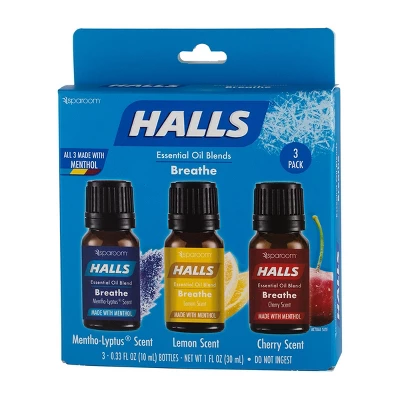 Ingredients: 10 mL Mentho-Lyptus® Essential Oil Blend: Natural Eucalyptus Fragrance, Menthol and Eucalyptus globulus (Eucalyptus) Leaf Oil10 mL Lemon Essential Oil Blend: Natural Lemon Fragrance, Menthol and Eucalyptus globulus (Eucalyptus) Leaf Oil10 mL Cherry Essential Oil Blend: Natural Cherry Fragrance, Menthol and Eucalyptus globulus (Eucalyptus) Leaf Oil HALLS®, the HALLS® logo, and MENTHO-LYPTUS are trademarks of Mondelēz International group, used under license.The statements expressed herein are those of sparoom® only and are not an endorsement by the HALLS® brand.