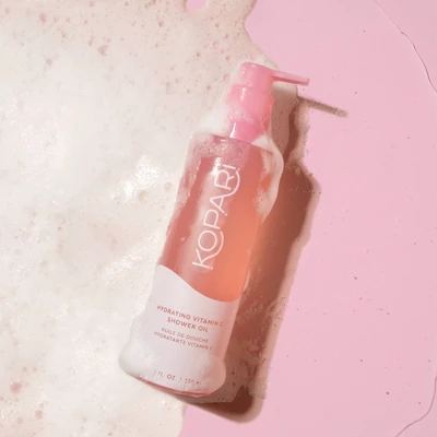 Kopari Beauty’s Hydrating Vitamin C Shower Oil with Hibiscus and Avocado Oil transforms into a sudsy foam to cleanse and hydrate skin without stripping moisture.
