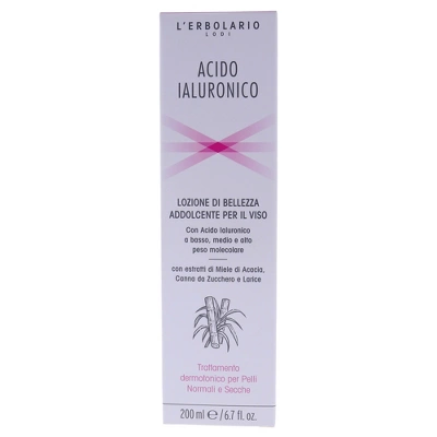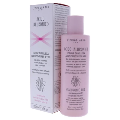 L’Erbolario Hyaluronic Acid Softening Beauty Lotion has the gentle properties of a lotion and is capable of offering the most simple beauty routine: the replenishing action of a treatment. It will soften, tone, and smooth your skin. This uniquely scented product nourishes your skin for a one of a kind experience. The excellent moisturizing action of hyaluronic acid with low, medium, and high molecular weights is combined with the nourishing activity of extracts of sugar cane, the emollient action of acacia honey, and the refreshing action of distilled cornflower water.