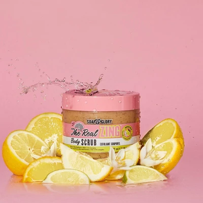 Introducing our The Real Zing Body Scrub – enriched with serious skin scrubbers, like sea salt and smashed sugar, that work to truly buff away dead skin cells leaving behind nothing but smoothed and cleansed feeling skin. With an AHA fruit complex, not only does it work wonders on dry legs and elbows, but it leaves skin feeling refreshed, re-energized and looking positively glowing! A positively pampering pick-me-up infused with a refreshing citrus fragrance blend of lemon, lime and neroli, to refresh the senses. Decadently delicious…