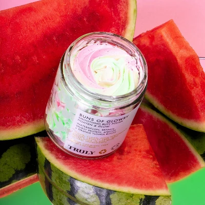 Give your tush an extra push with Truly’s Buns Of Glowry Tighten & Glow Smoothing Butt Polish. Its two key ingredients are wheat protein and watermelon extract. Wheat protein’s film-forming properties will increases firmness of the skin, while minimizing the appearance of fine lines and cellulite.* Amino-rich watermelon extract will intensely hydrate and plump your skin – leaving you with a firm derriere that glows. In the shower or bath, take a small amount of Buns Of Glowry, mix with water to get a nice lather. Rub on your booty in circular motions and rinse. *Results can vary by user, continued use for an extended period of time provides the best chance of seeing results. Even the slightest improvement or minimal change in appearance or feel should be considered a positive result. The key ingredients are natural extracts and should not be compared to results rendered by surgical or medical procedures. Benefits are based on clinical trial results, positive customer feedback, testimonials, positive before & after results and ingredient benefit profiles. Results are not guaranteed.